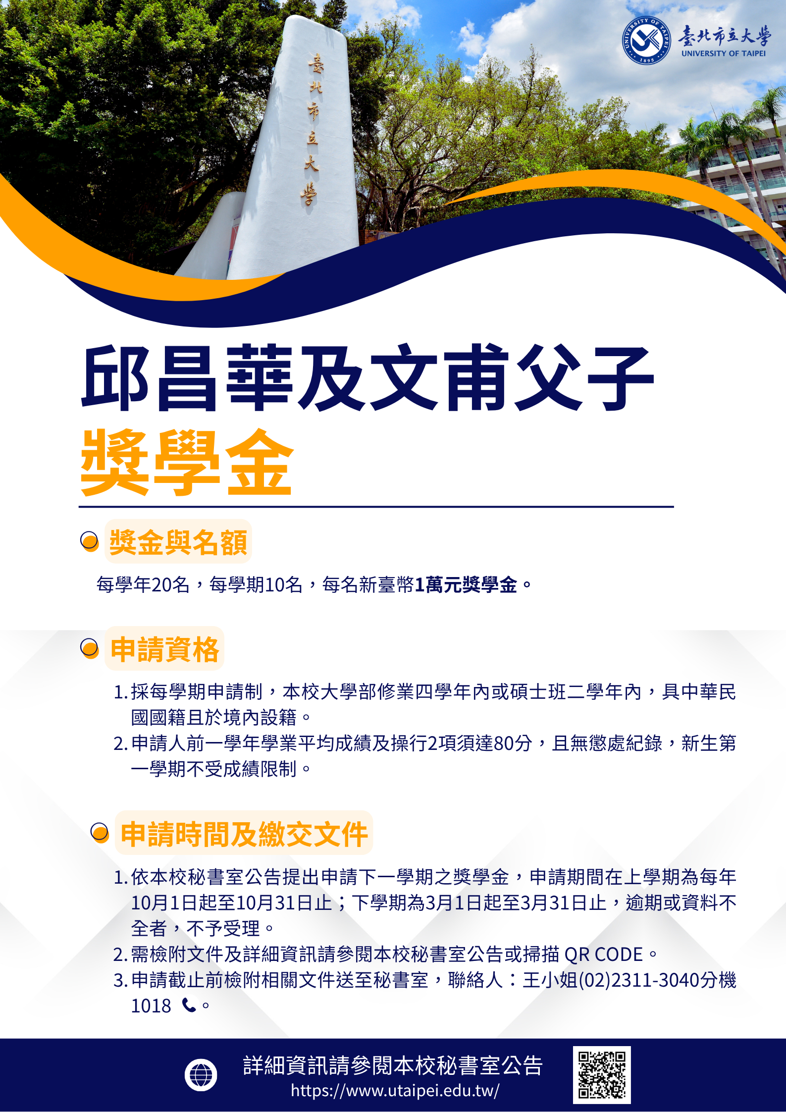 臺北市立大學邱昌華及文甫父子獎學金獎助辦法及申請表