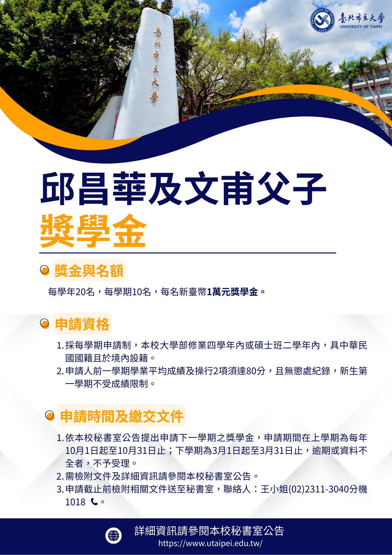 臺北市立大學邱昌華及文甫父子獎學金獎助辦法及申請表 【申請期限延長至 115年4月14日(星期二)止】。